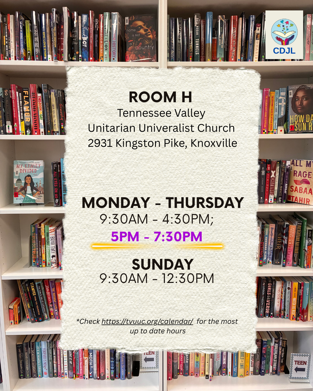The Children’s Diversity & Justice Library is located inside the Tennessee Valley Unitarian Universalist Church at 2931 Kingston Pike Knoxville, TN 37919 Room H. Enter the building through the main double glass doors and turn right down the hallway on your right. Go through a set of double wooden doors and the library will be the second room on your left.